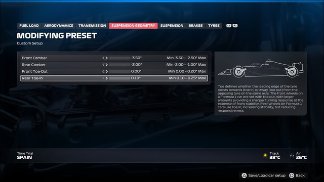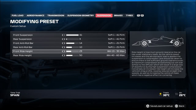 Just want to say thank you for these writeups, started using these setups this week as I’ve just started playing with no assists and needed as much car stability as I could get to help me, and these are so good! Always feel like I have total control of the car and finally have some setups that don’t lose the back end as soon as tyre wear gets above 15% (that was probably a skill issue though).. Did my first 50% race at Australia, and although I crashed in qualifying so started at the back, after getting used to the feel and controlling acceleration/braking better, I ended up finishing 6th
