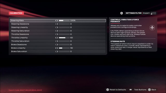 Caveat 1 – These setups were made with my Controller Calibration settings as follows – Throttle Linearity on 60, Brake Linearity on 30, everything else as I found them on default: